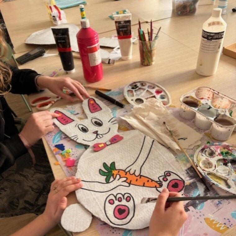Jeunes patients et rĂ©sidents d’un EHPAD partenaire se sont rĂ©unis pour confectionner ensemble des dĂ©corations de PĂąques — un moment simple, mais profondĂ©ment enrichissant.